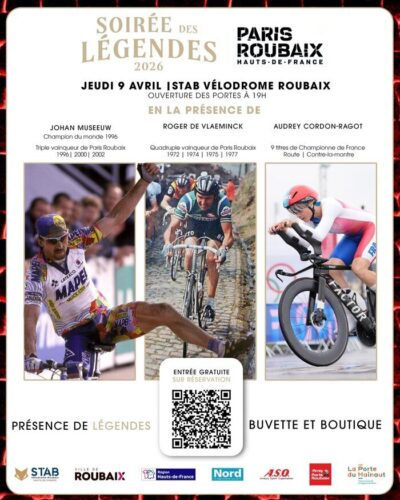 Le jeudi 9 avril, dès 19h, venez partager un moment privilégié au Stab Vélodrome avec les plus grands noms du vélo de route et des pavés. Cet événement gratuit (sur réservation) est le rendez-vous incontournable pour tous les passionnés de cyclisme avant le grand départ de Paris-Roubaix.